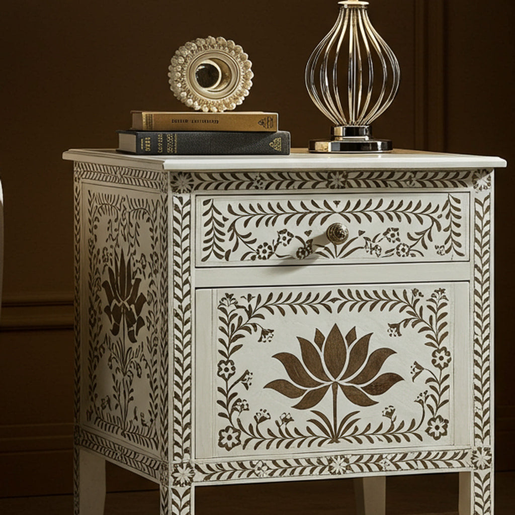 Handcrafted Floral Patterned Wooden Side Table | Luxury Handmade Bedside Table