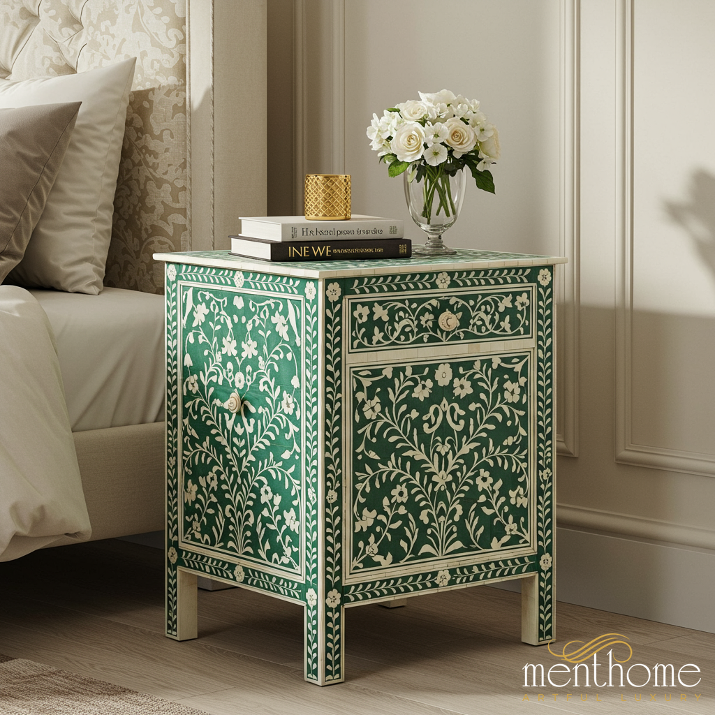 Handcrafted Green and White Floral Bone Inlay Nightstand | Luxury Handmade Bedside Table