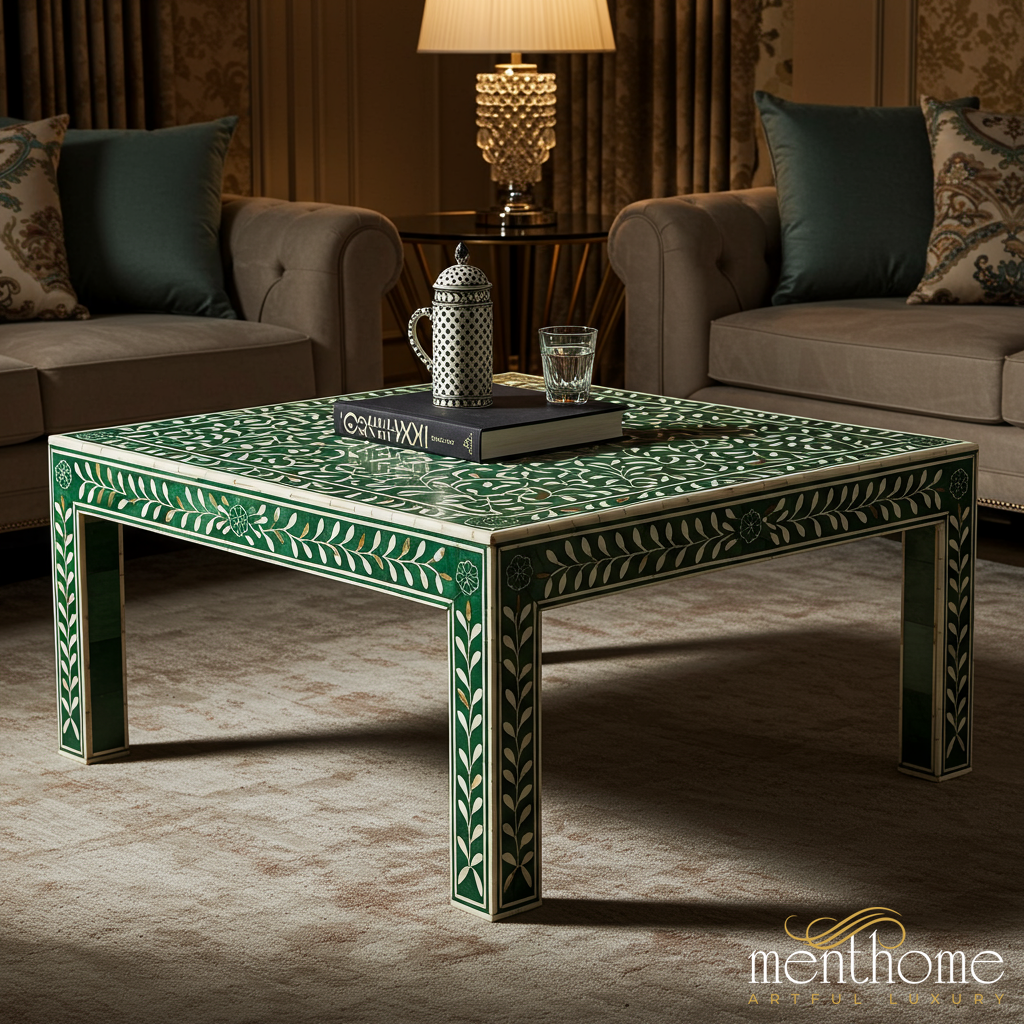 A beautifully handcrafted square coffee table featuring intricate bone inlay work with a green and white floral motif. Perfectly suited for adding a touch of elegance and artisanal charm to any living room or sitting area.