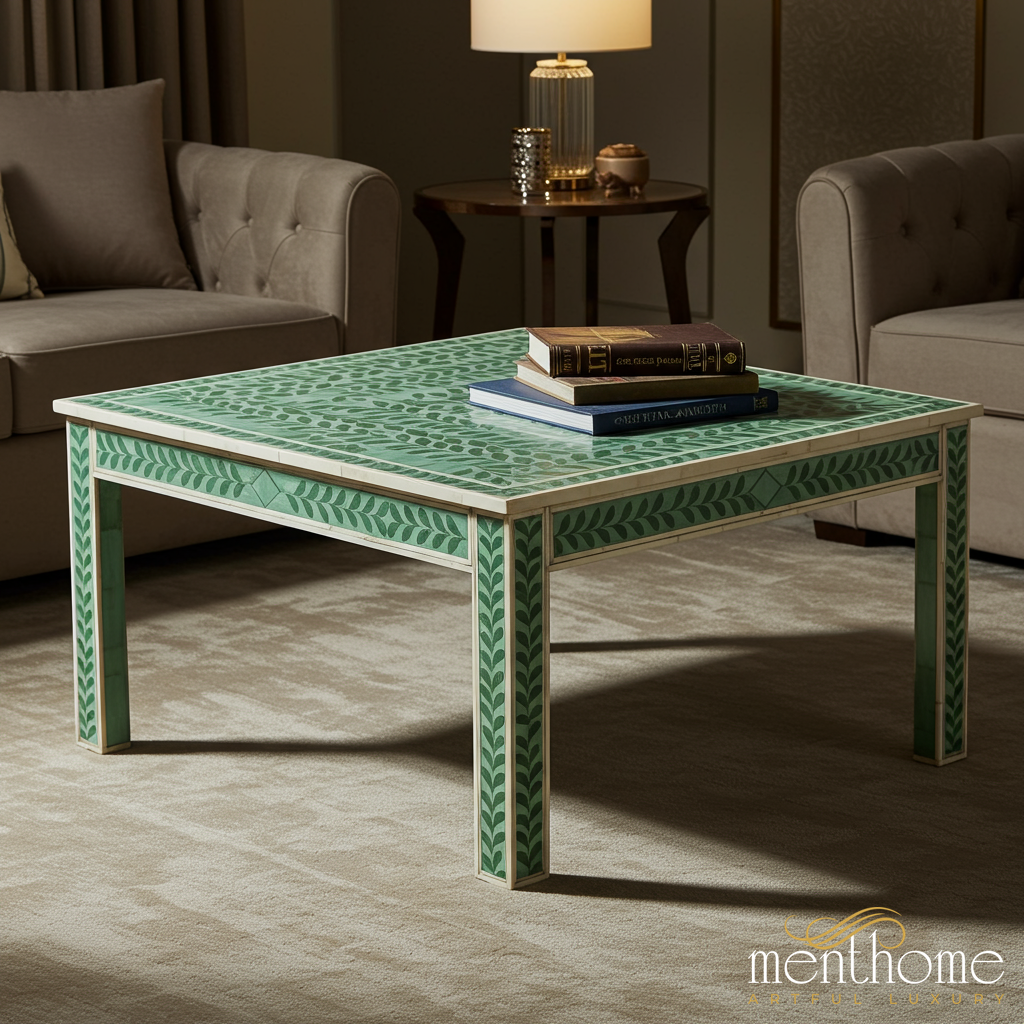 A beautifully handcrafted square coffee table featuring intricate green leaf-patterned bone inlay work. Designed to add a touch of elegance and charm to your living room, this table is both a functional and decorative centerpiece.