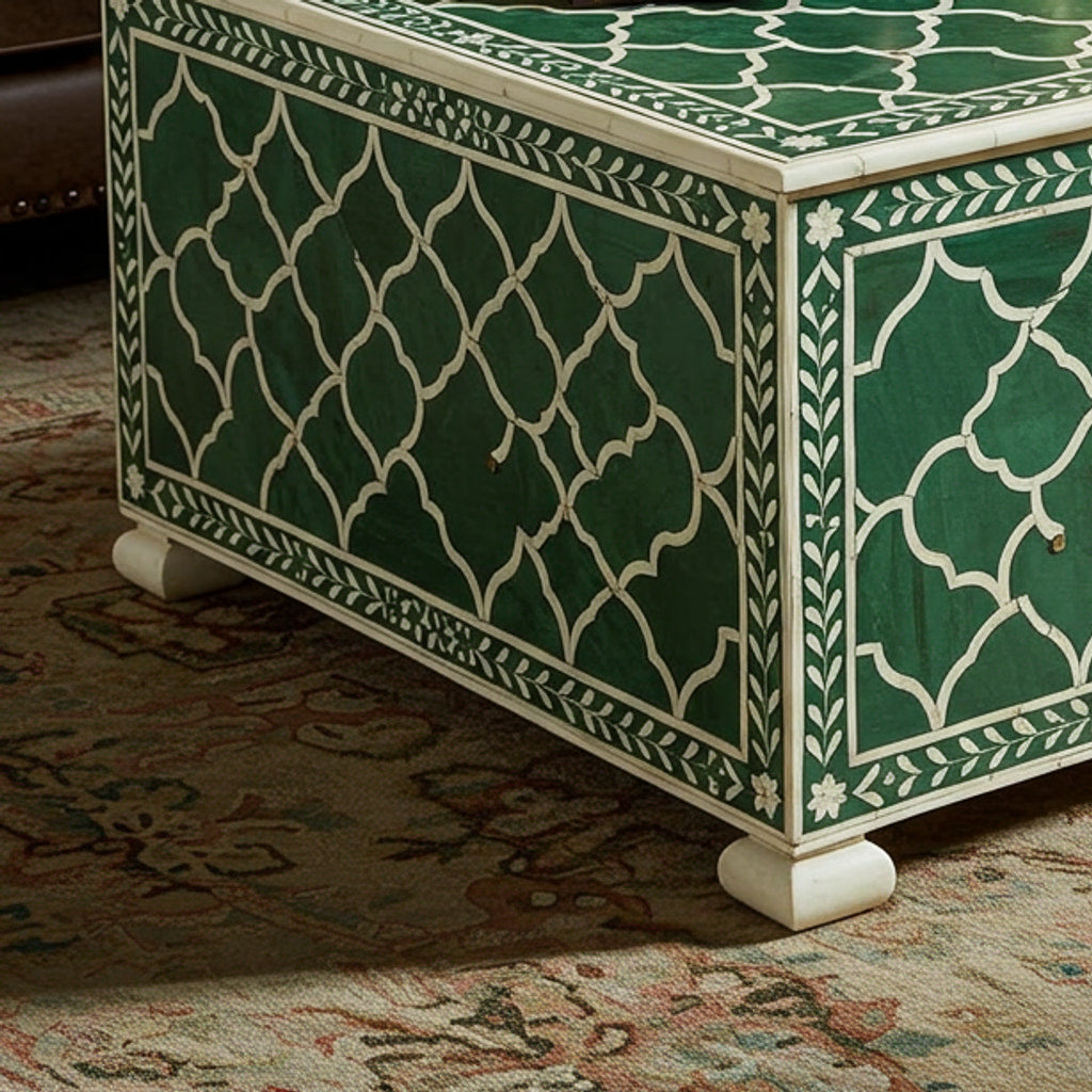 This handcrafted green coffee table features intricate bone inlay details with a beautiful geometric pattern. Designed to add an elegant and artistic touch to any living space, it combines functionality with exquisite craftsmanship.