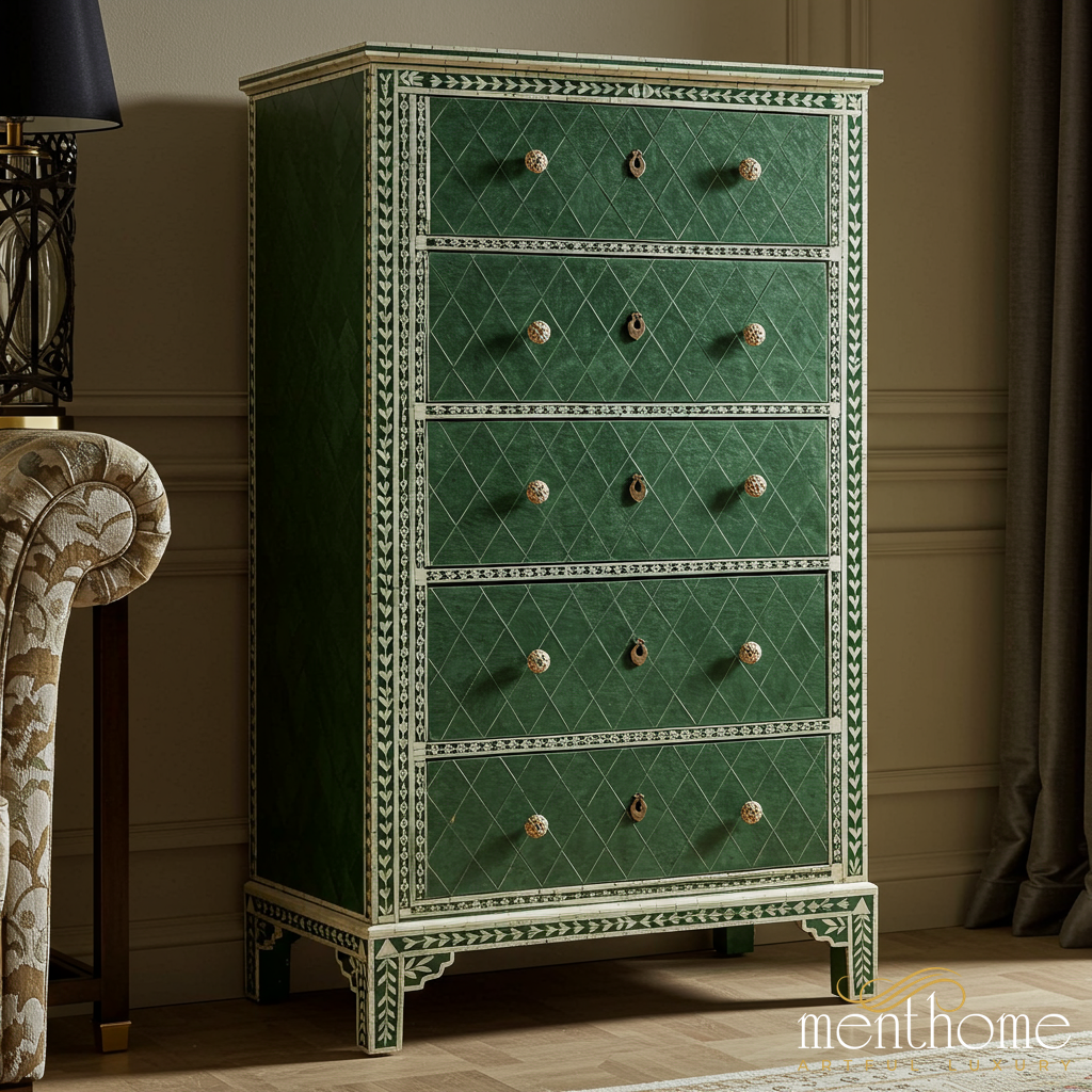 This elegant tall dresser features a handcrafted bone inlay design with a green finish, offering a sophisticated storage solution with five spacious drawers. Its intricate leaf patterns and diamond motifs add a touch of artisanal charm to any bedroom or living space.