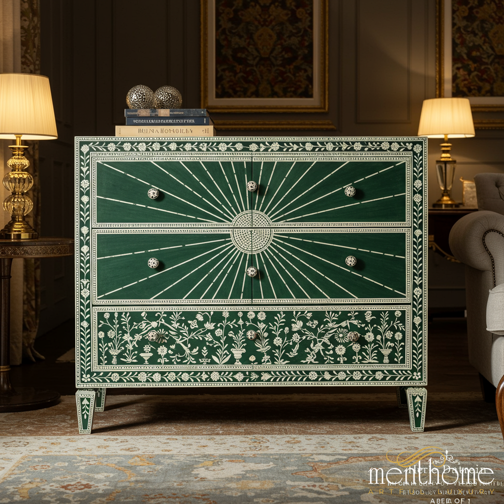 A beautifully handcrafted chest of drawers featuring intricate floral and sunburst bone inlay designs on a green wooden base. This exquisite piece combines traditional craftsmanship with elegant details, perfect for adding a touch of sophistication to any room.