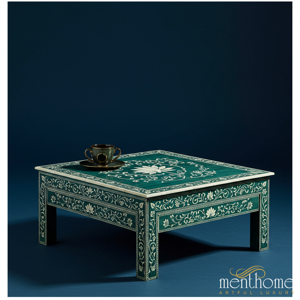 A beautifully handcrafted square coffee table featuring intricate floral inlay designs on a rich green surface. Perfect for adding an artistic and elegant touch to your living room or lounge area.