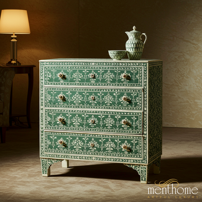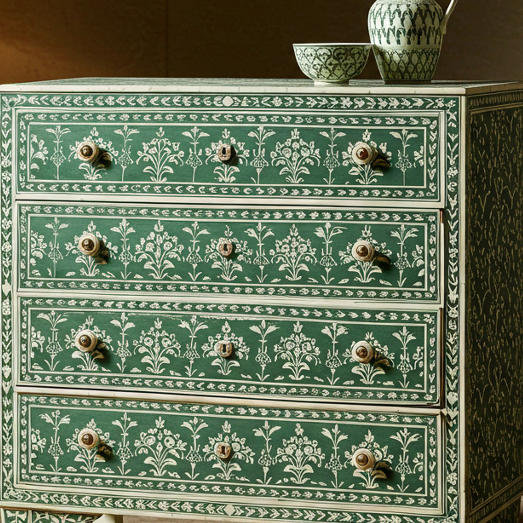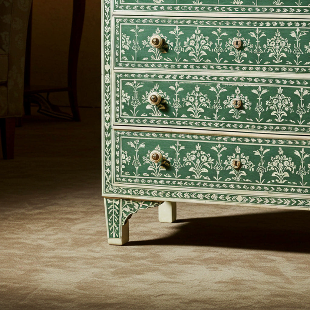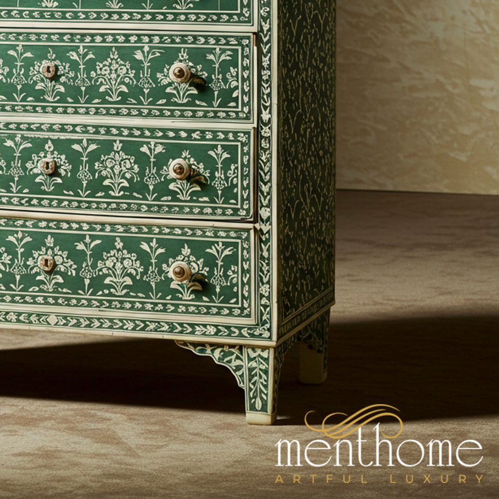 A beautifully handcrafted wooden chest of drawers featuring intricate green and white floral patterns. This piece combines traditional craftsmanship with elegant design, perfect for adding a touch of artistry and storage functionality to any room.