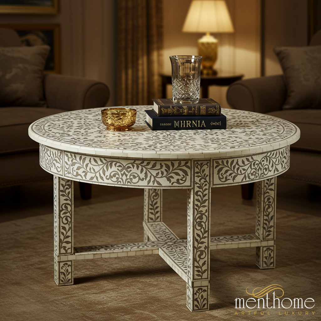 Handcrafted Inlaid Bone and Wood Round Coffee Table | Luxury Handmade Coffee Table