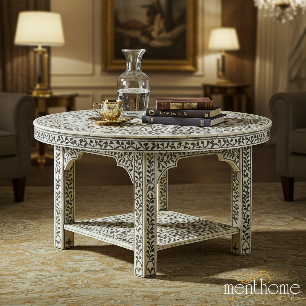Handcrafted Inlaid Bone & Wood Round Coffee Table | Luxury Handmade Coffee Table