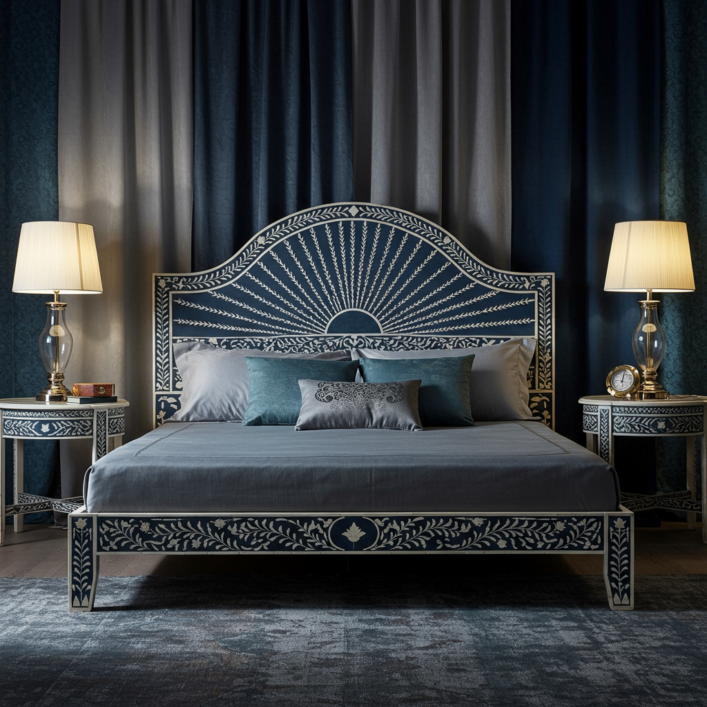 An exquisite handcrafted wooden king size bed featuring intricate white inlay work against a deep navy blue finish. This set comes complete with matching elegant round nightstands, enhancing the classic and luxurious bedroom atmosphere. The detailed vegetal and sunburst motifs create a timeless design perfect for sophisticated interiors.