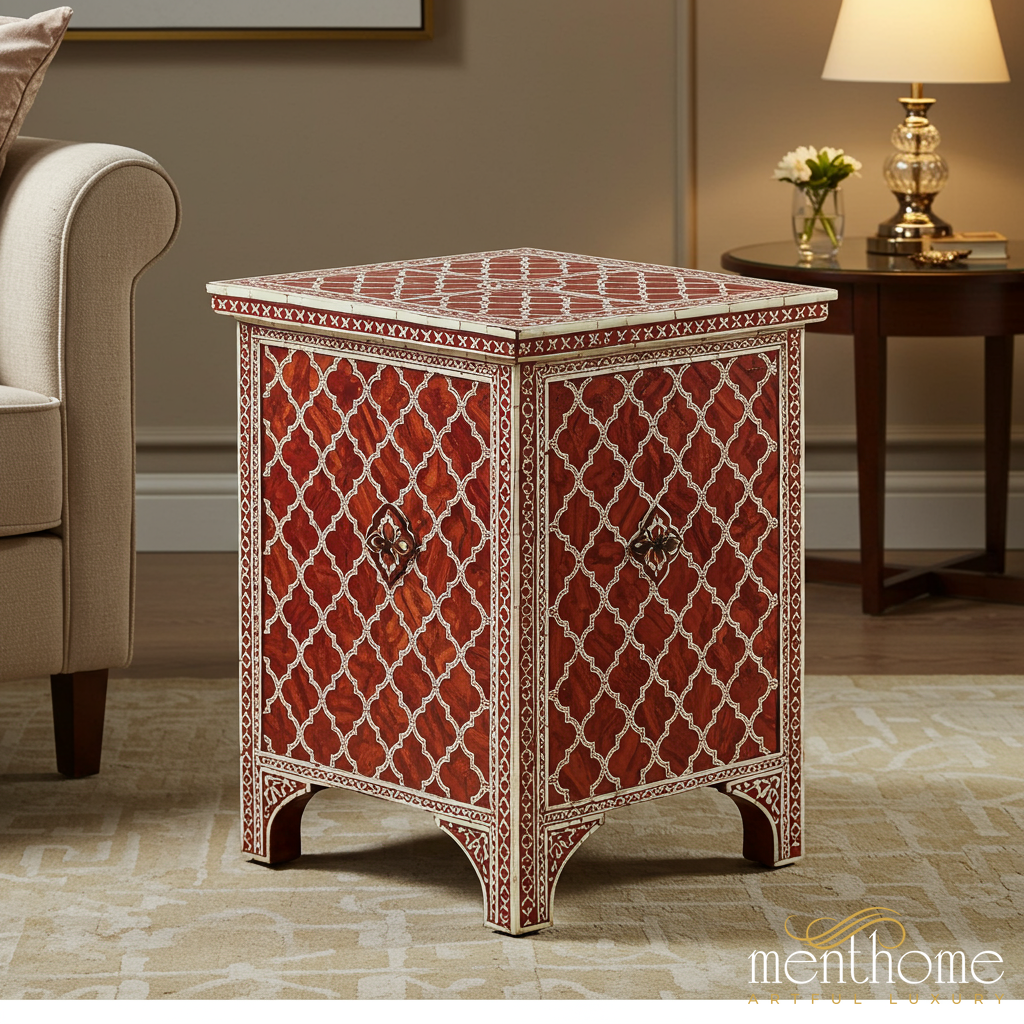This beautifully handcrafted side table features intricate inlaid geometric patterns on all sides, enhancing any living space with a touch of traditional elegance. Made from rich wood with detailed white inlay work, it perfectly blends functionality and aesthetic appeal.