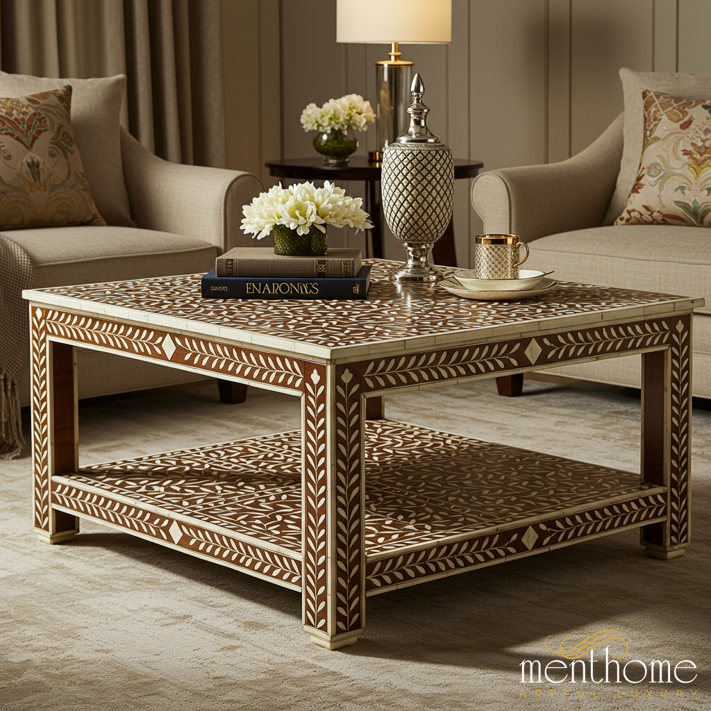 This exquisite handcrafted square coffee table features intricate bone inlay designs on a sturdy wooden frame, blending traditional craftsmanship with modern elegance. It offers both style and functionality with its spacious top and additional lower shelf for storage or display.