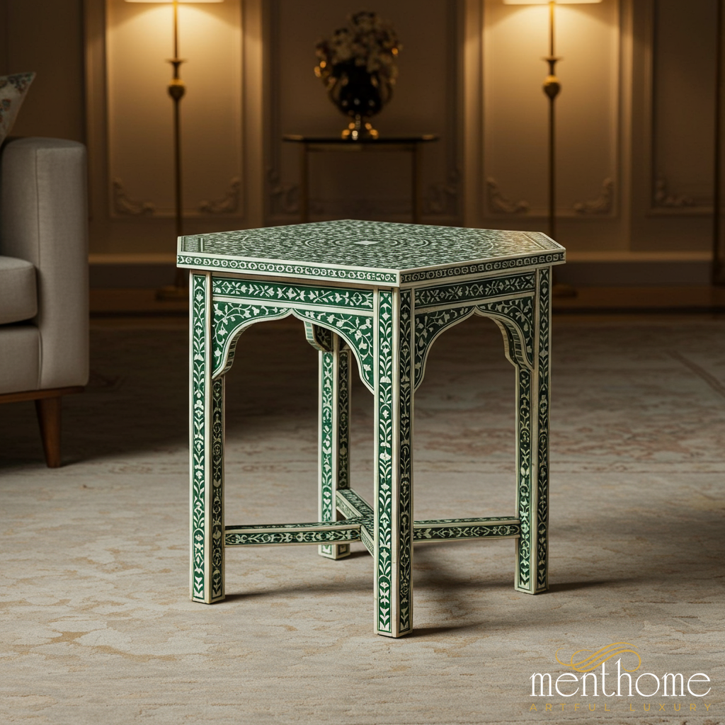 A beautifully handcrafted hexagonal side table with intricate green and white floral inlay designs, perfect for adding an artistic touch to any living space.