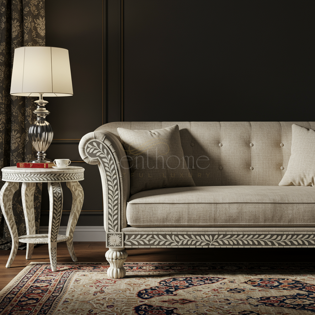 Handcrafted Inlay Upholstered Sofa with Decorative Carved Details | Luxury Handmade Sofa