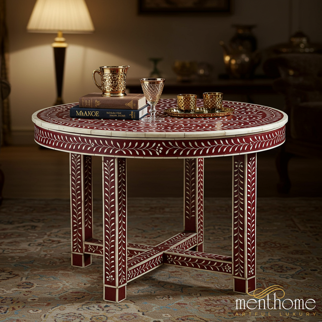 Handcrafted Red Bone Inlay Round Coffee Table | Luxury Handmade Coffee Table