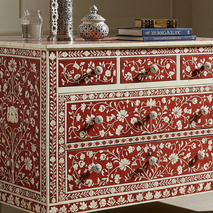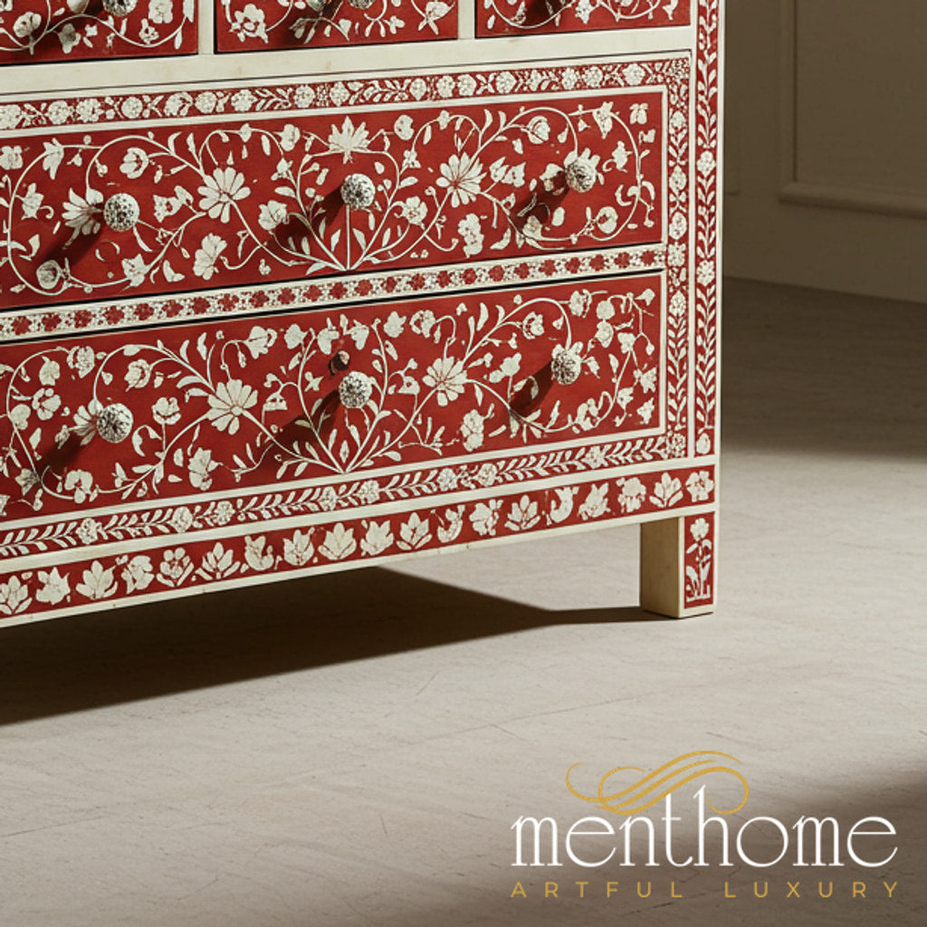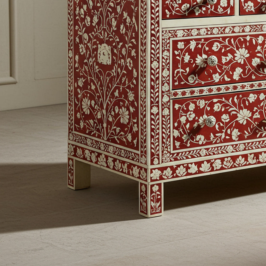 Handcrafted Red Floral Bone Inlay Chest of Drawers | Luxury Handmade Chest of Drawer