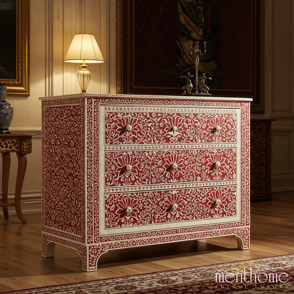 Handcrafted Red Floral Inlay Chest of Drawers | Luxury Handmade Chest of Drawer