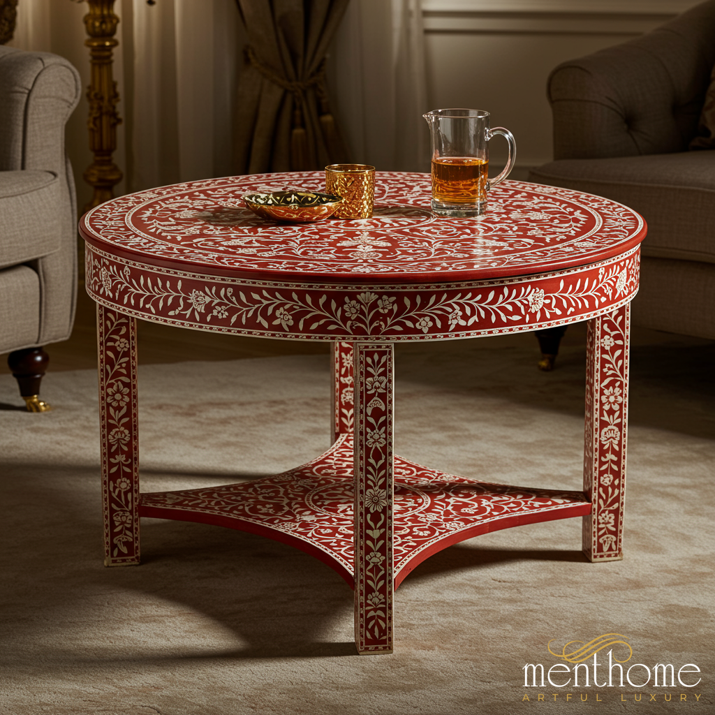 Handcrafted Red Floral Inlay Round Coffee Table | Luxury Handmade Coffee Table
