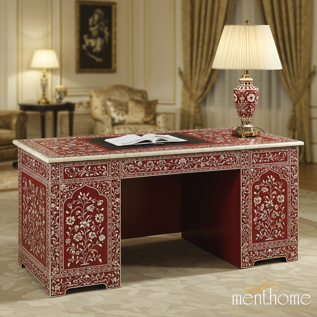 Handcrafted Red Inlaid Wooden Desk with Floral Design | Luxury Handmade Desk