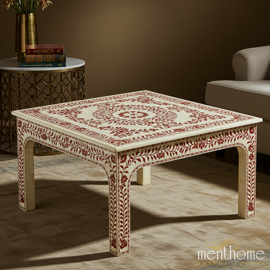 This beautifully handcrafted square coffee table features intricate floral inlay designs in a rich red hue, set against a creamy white background. Perfect for adding an artistic and elegant touch to your living room decor.
