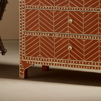 This intricately designed wooden chest of drawers features detailed bone inlay work forming geometric patterns. Its warm earthy tones and craftsmanship make it an elegant storage solution for any room.
