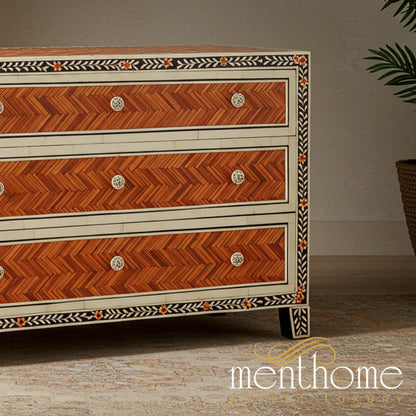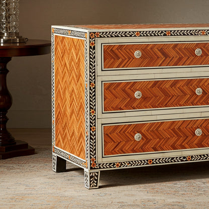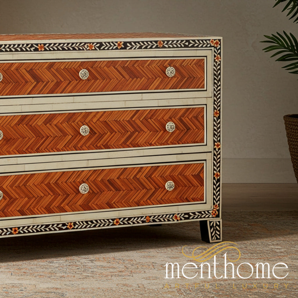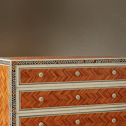 A beautifully handcrafted wooden chest of drawers featuring intricate floral inlay work and a herringbone wood pattern. This elegant piece combines traditional craftsmanship with functional storage, perfect for adding charm and sophistication to any room.