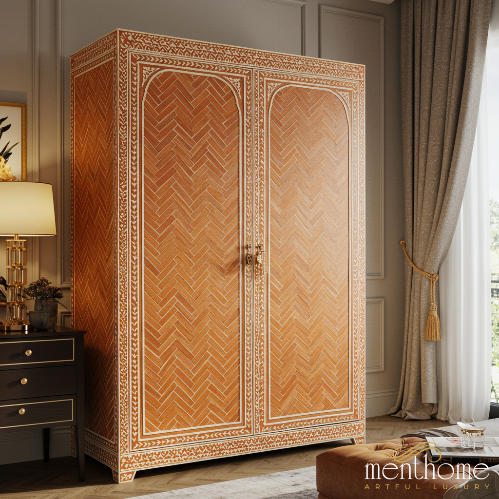 This exquisite wardrobe features a stunning handcrafted wooden structure complemented by detailed bone inlay work in a traditional herringbone pattern. Perfect for adding a touch of elegance and sophistication to any bedroom or dressing area, this piece combines storage functionality with artistic craftsmanship.