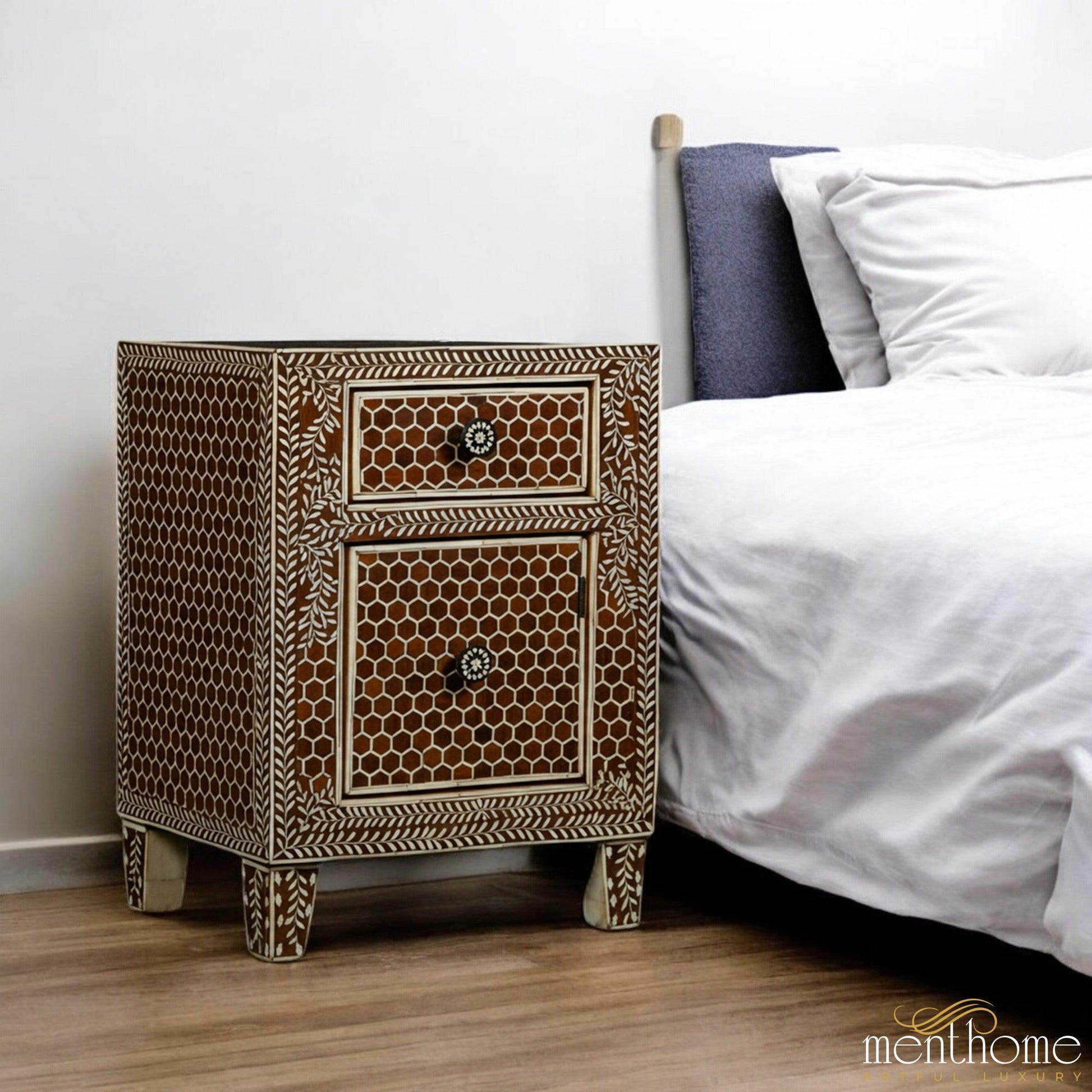 Handmade Brown Bone Inlay Bedside Table with Two Drawers | Luxury Handmade Bedside Table
