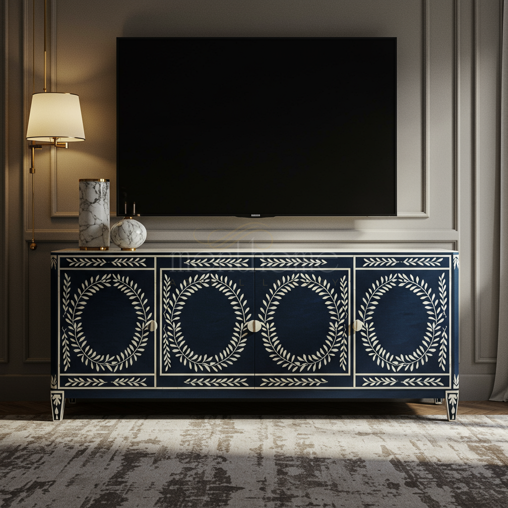 Sophisticated and elegant, this inlay TV cabinet features a deep blue finish with intricate white leaf motif patterns. The cabinet offers a balanced blend of classic and contemporary design, perfect for elevating your living space while providing ample storage.