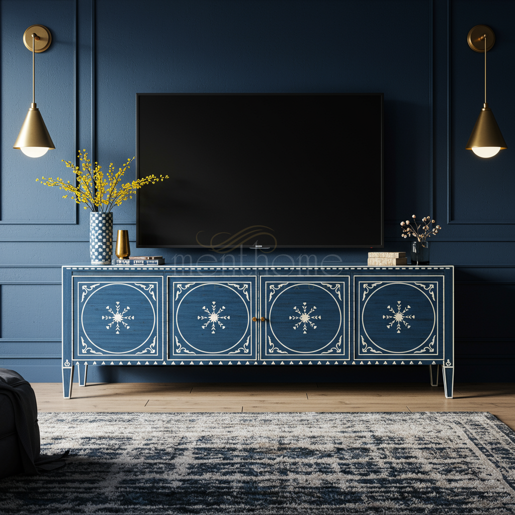 A sophisticated blue TV cabinet featuring intricate white inlay patterns on its front panels, offering a stylish and functional storage solution to complement any modern or vintage living space.