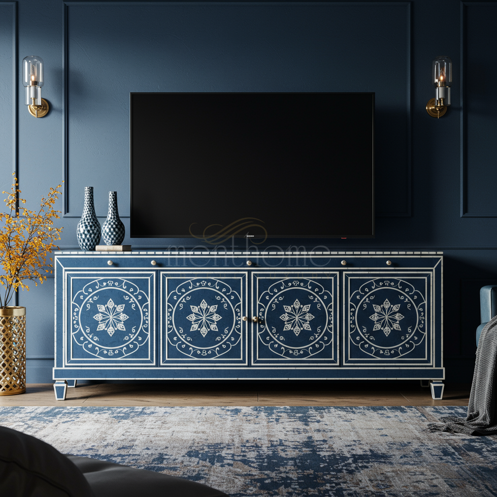 This exquisite inlay TV cabinet features a deep blue finish with intricate white floral and geometric inlay patterns, combining artistic craftsmanship with functional design. Designed to complement contemporary and classic interiors, it offers ample storage space with four doors, ideal for maintaining a tidy living room while showcasing a luxurious aesthetic.