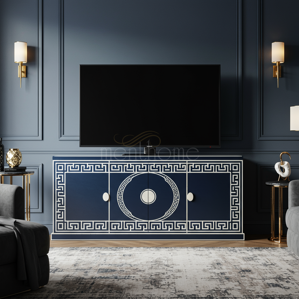 Exuding timeless elegance, this inlay TV cabinet features a striking navy blue finish with intricate Greek key patterns in contrasting white, perfectly complementing sophisticated living spaces. The cabinet combines classical design with functional storage, offering ample space to organize media accessories while supporting your television in style.