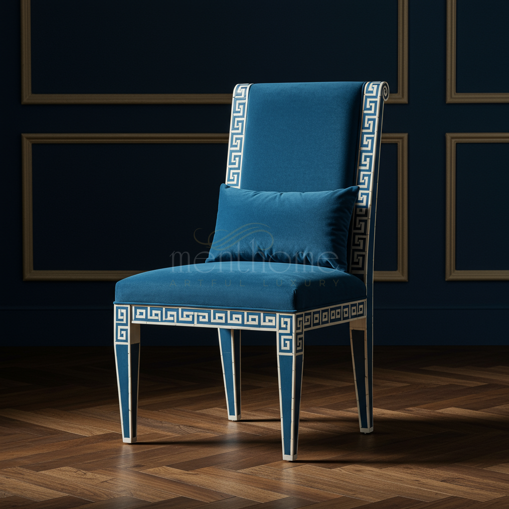 Inlay Blue Velvet Chair with Greek Key Pattern | Luxury Handmade Chair