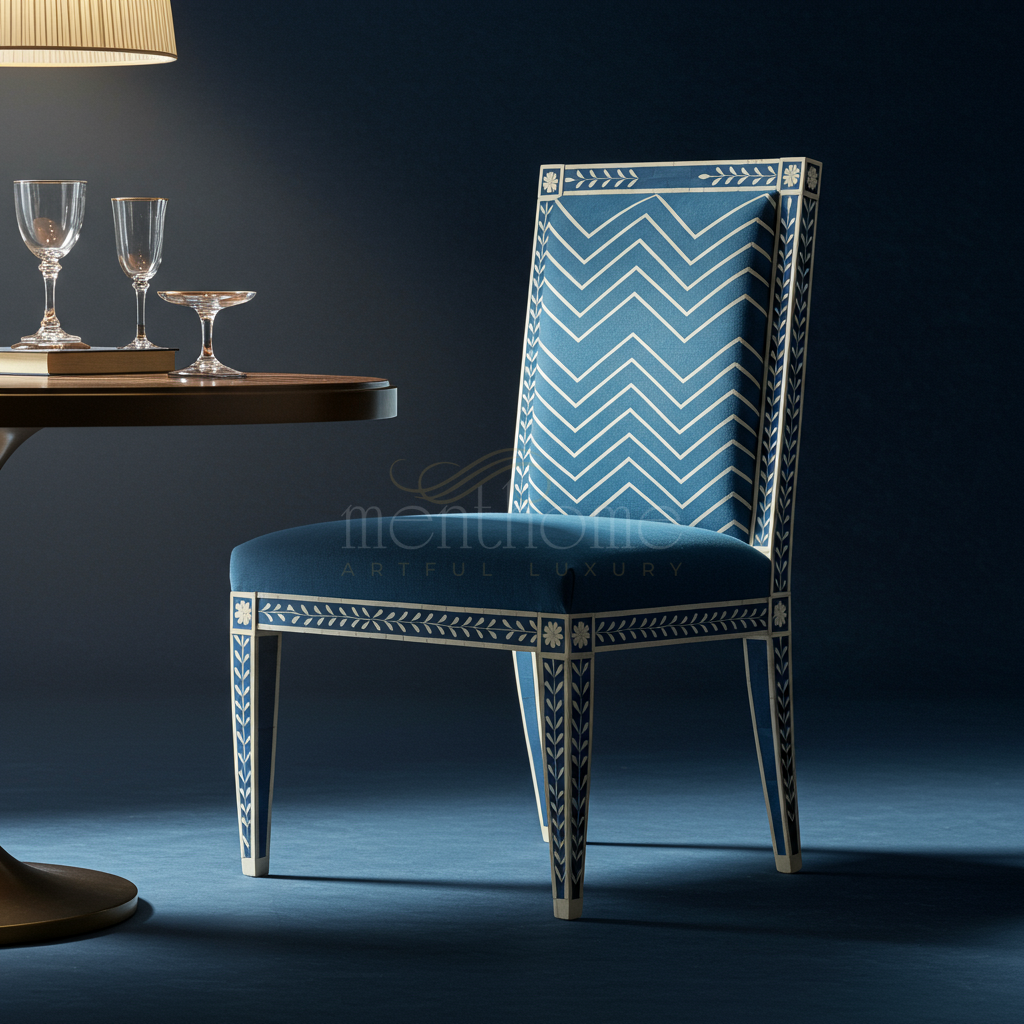 The Inlay Chair is a luxurious seating piece featuring exquisite inlay craftsmanship. Adorned with intricate floral and chevron patterns, this elegant chair combines classic artistry with modern comfort, making it a stunning addition to any upscale dining or living space.