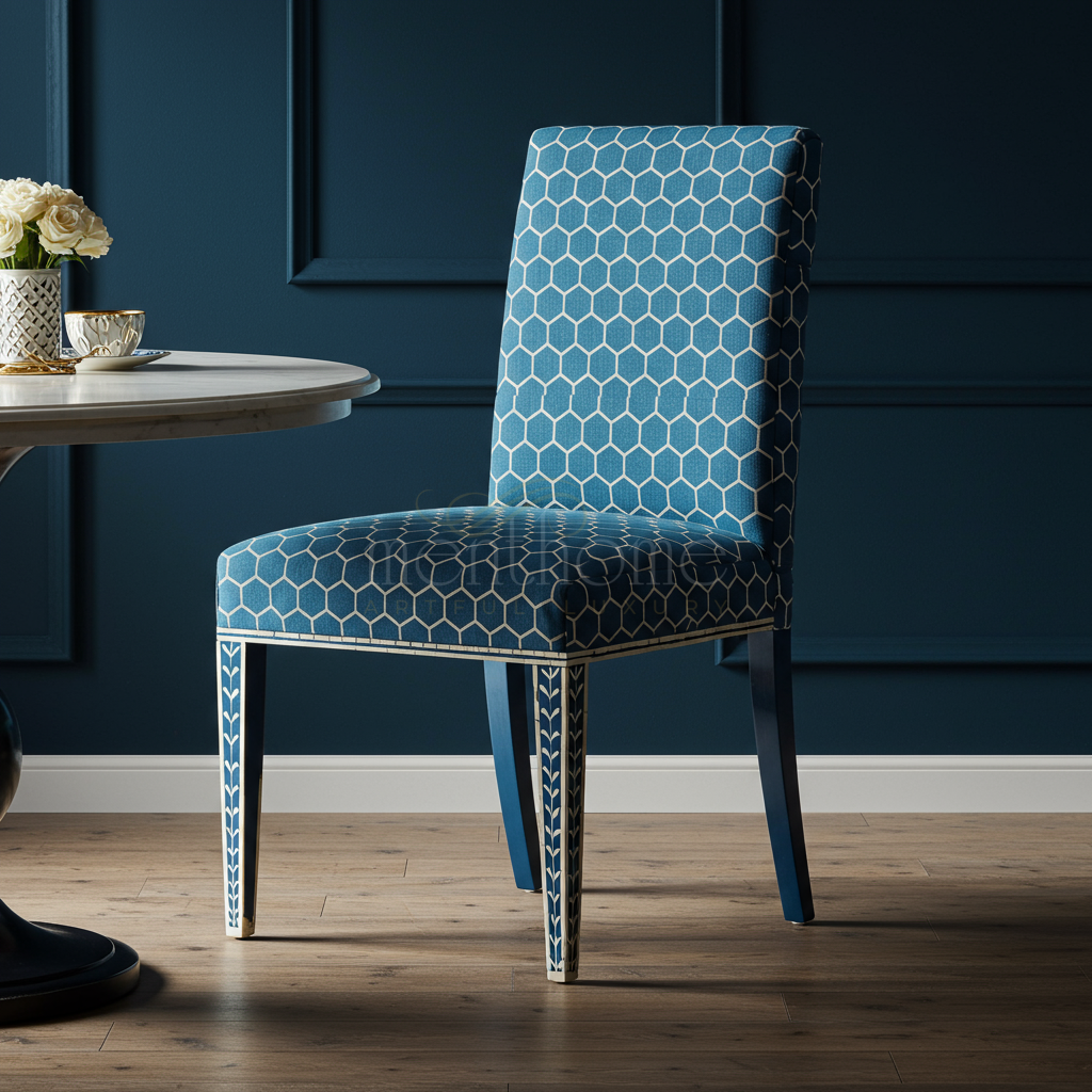 The Inlay Chair features a striking geometric hexagonal pattern upholstered in a rich blue fabric, complemented by delicate white inlay details on the legs. This chair combines modern design aesthetics with traditional craftsmanship, perfect for adding a sophisticated touch to any dining or living space.