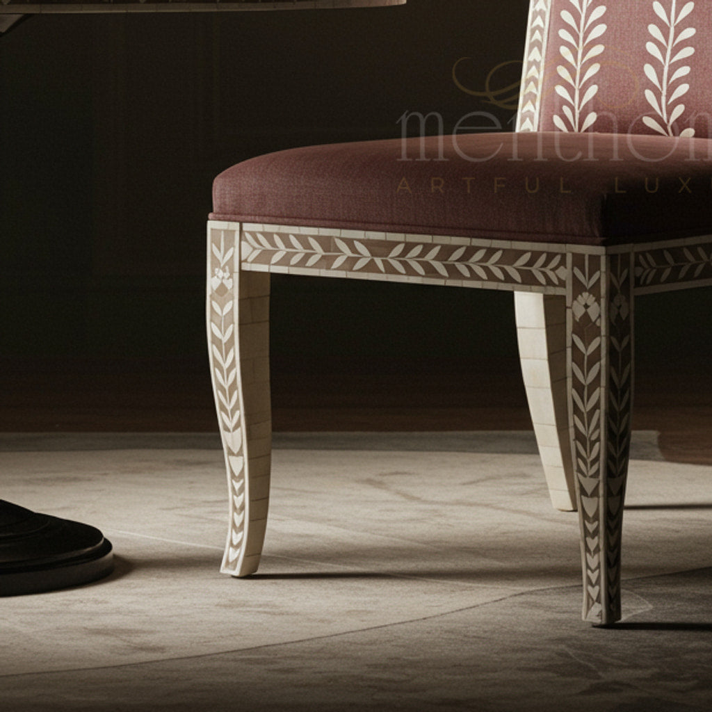 The Inlay Chair boasts an exquisite handcrafted design combining intricate bone inlay detailing on its wooden frame with a rich, upholstered seat and backrest. Featuring elegant leaf motifs and a refined color palette, this chair seamlessly blends artistic luxury with comfortable seating, perfect for sophisticated interior environments.