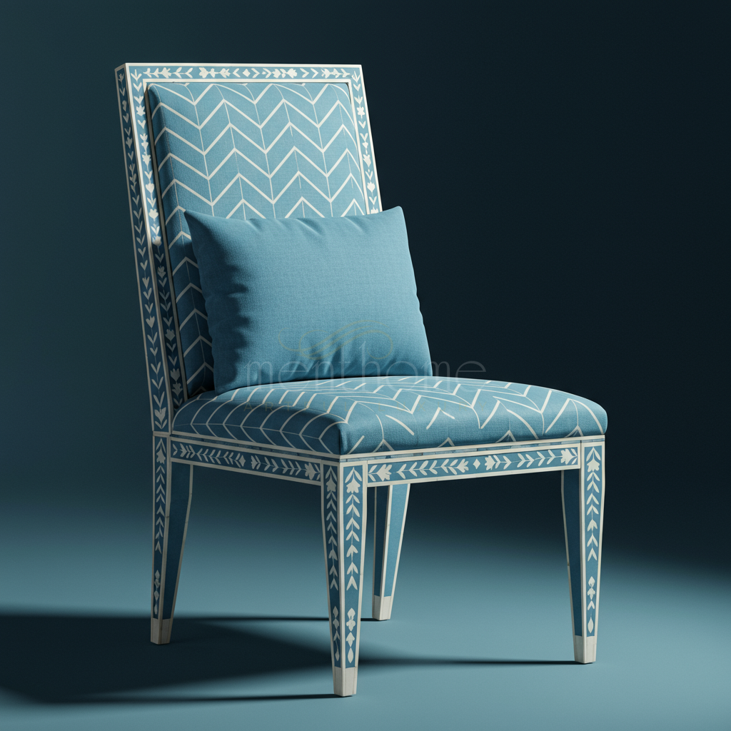 This elegant Inlay Chair features a finely crafted wooden frame with intricate white floral and geometric inlay designs that beautifully complement the soft blue upholstery. The plush padded seat and backrest, adorned with a subtle geometric pattern, provide exceptional comfort and style, making it a perfect addition to any sophisticated living or dining space.