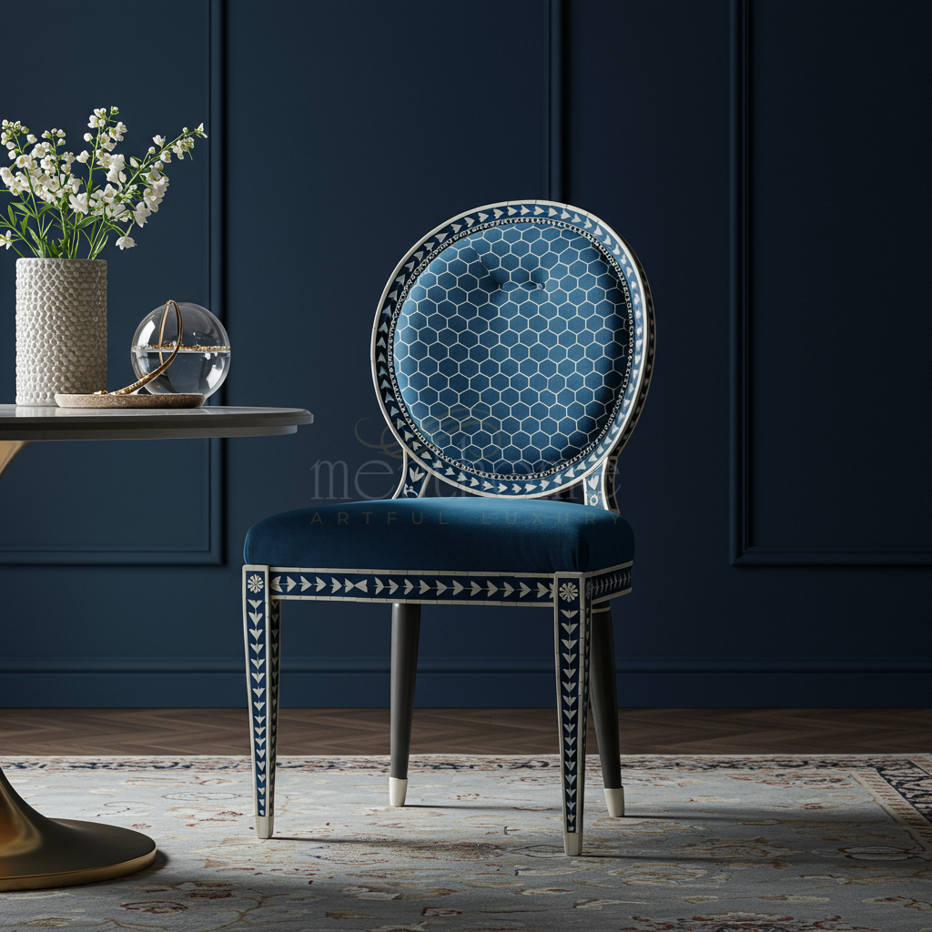 This exquisite Inlay Chair showcases a harmonious blend of artistic craftsmanship and luxurious comfort. Featuring a round back with intricate white inlay detailing against a deep blue velvet upholstery that highlights modern elegance. The chair's slender, tapered legs are accented with matching inlays and capped with white feet, making it a refined addition to any sophisticated living or dining space.