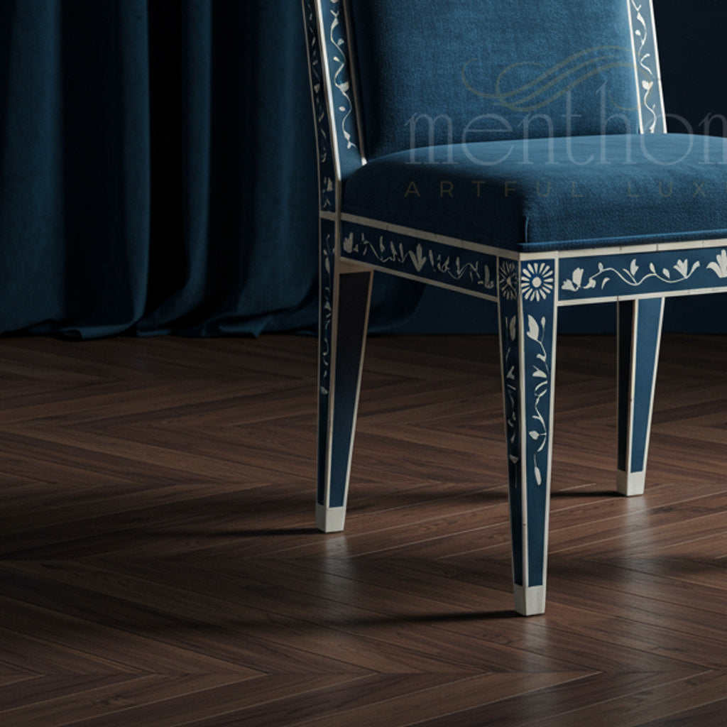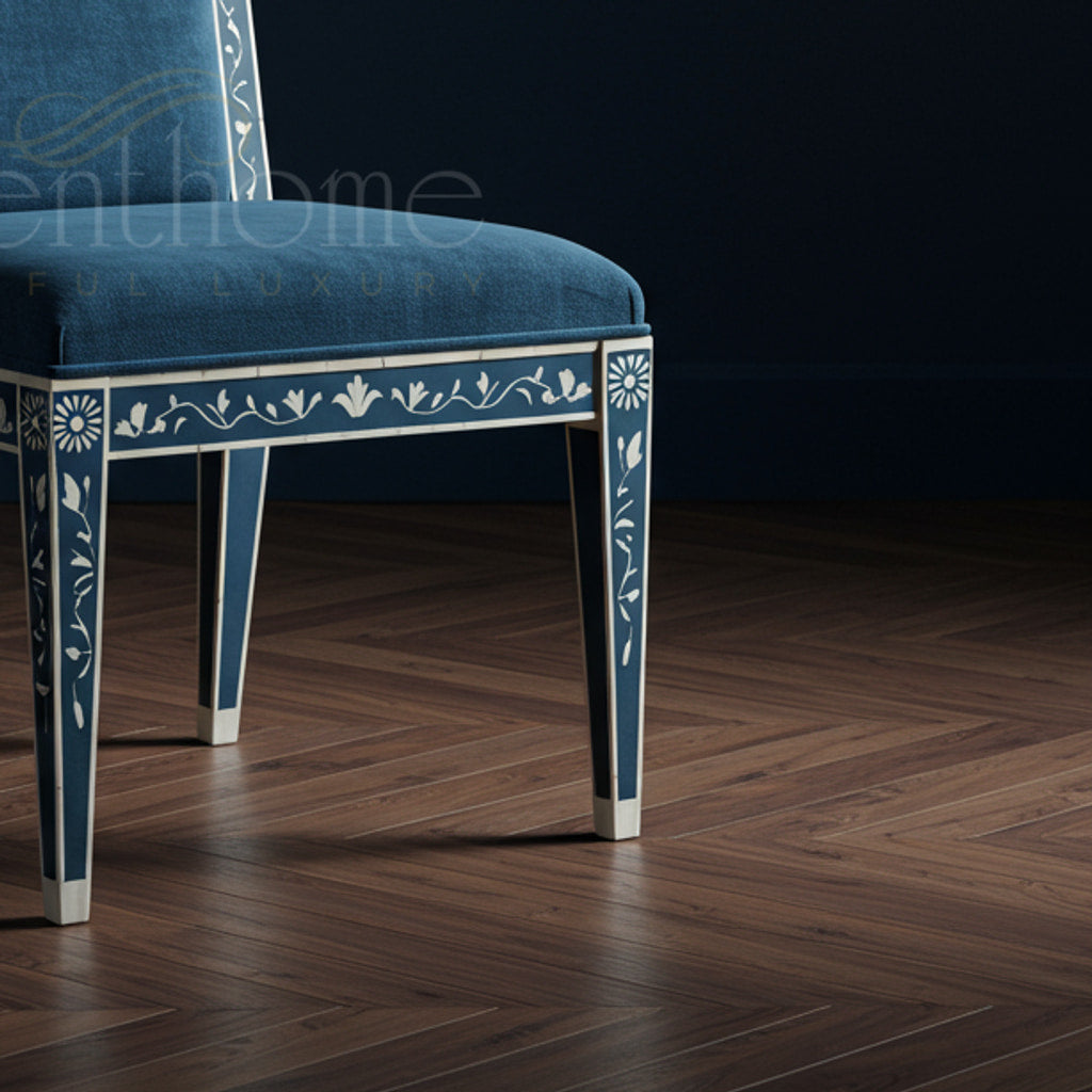 This exquisite Inlay Chair features intricate white floral inlay designs on a deep blue wooden frame, complemented by plush blue velvet upholstery. Designed for elegance and comfort, this chair makes a refined statement in any luxurious living or dining space.