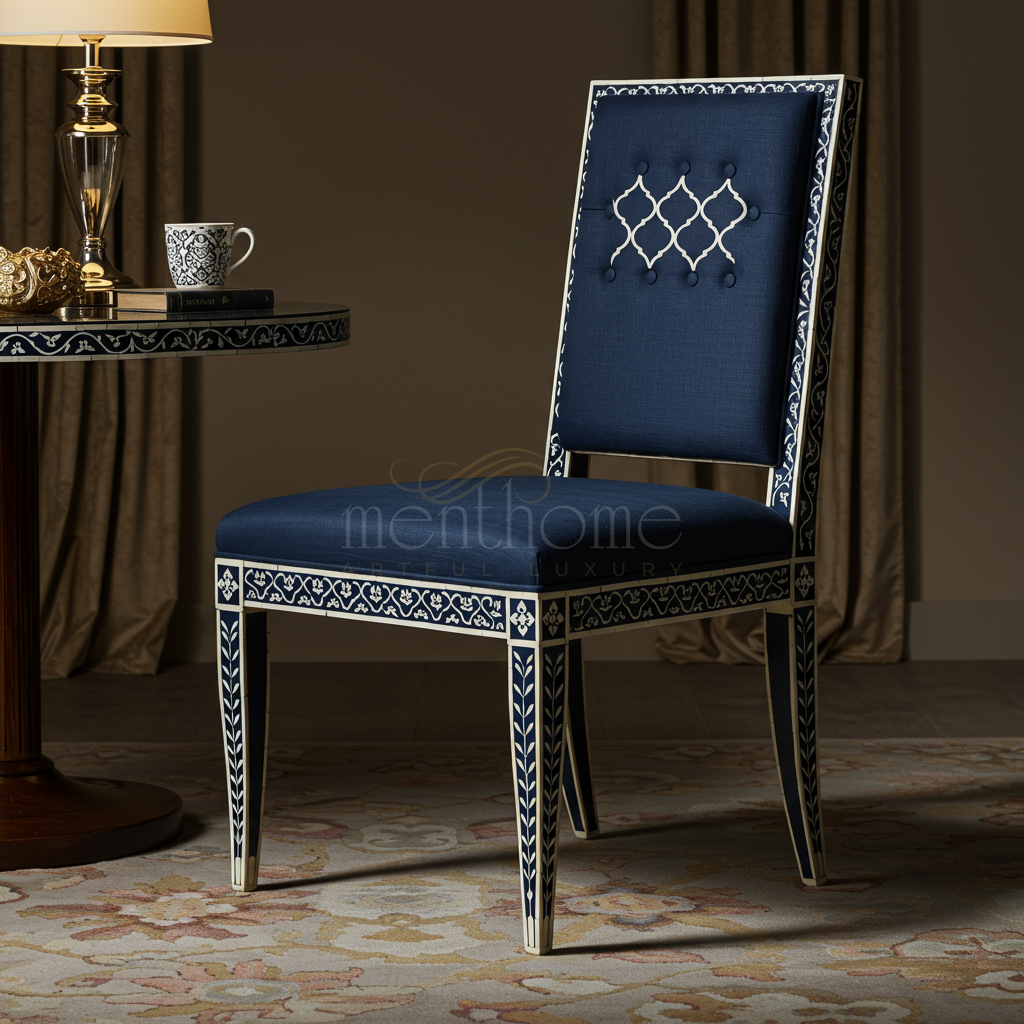 This luxurious Inlay Chair features a sophisticated navy blue upholstered seat and backrest, beautifully complemented by detailed white floral and geometric bone inlay designs along the frame. Perfect for adding a refined touch to your living space, dining room, or office.