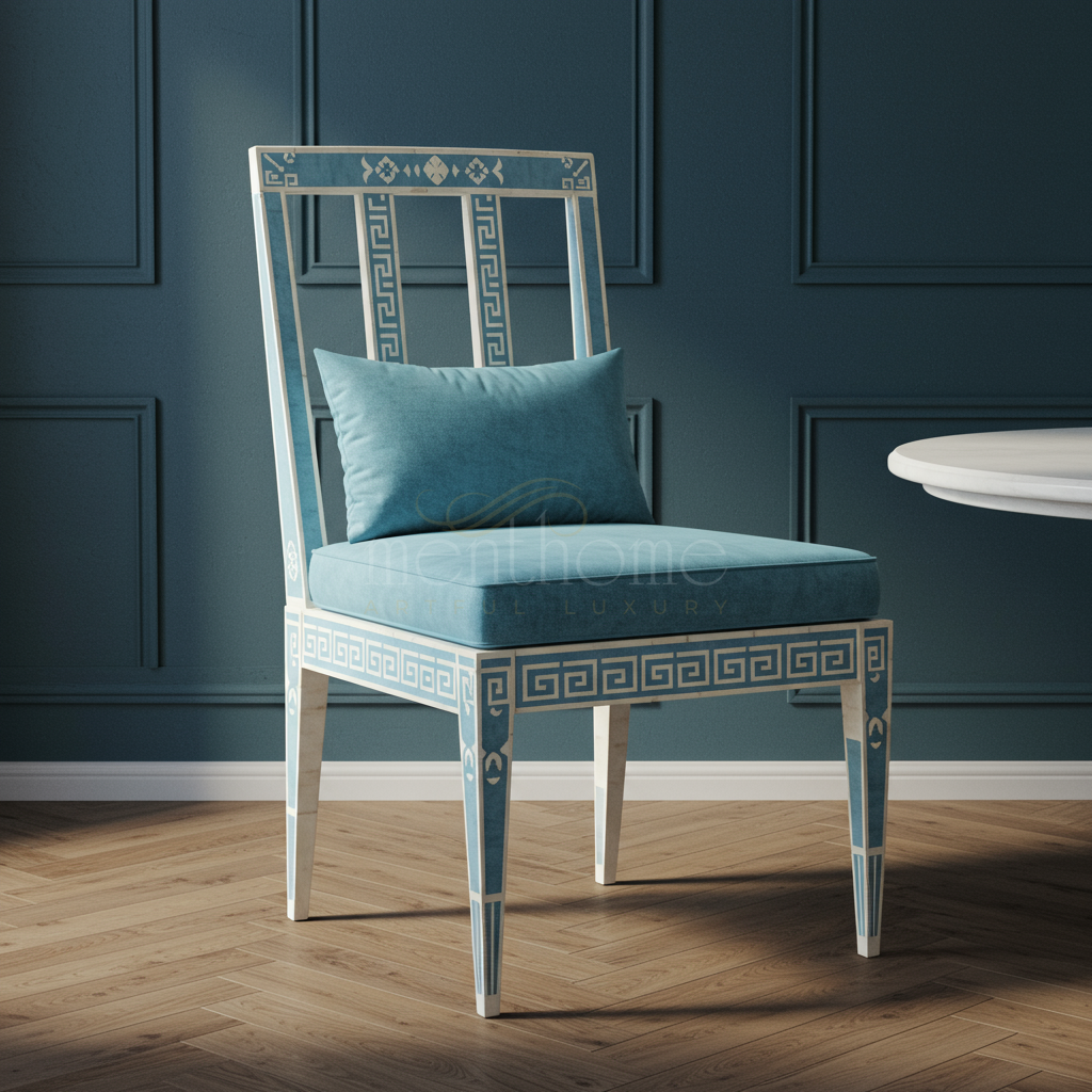 Inlay Chair with Greek Key Pattern and Teal Upholstery | Luxury Handmade Chair