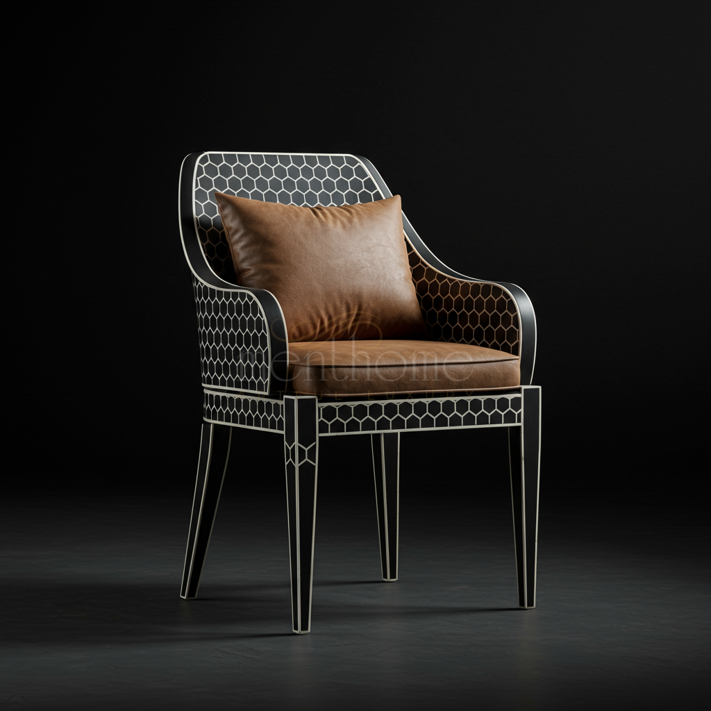 The Inlay Chair is a sophisticated blend of classic craftsmanship and modern design, featuring a striking honeycomb pattern inlay on a sleek black frame. Enhanced with a plush brown leather cushion and matching pillow, it offers both comfort and style, perfect for elevating any interior space.