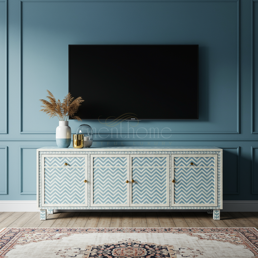 An elegant inlay TV cabinet featuring a striking chevron pattern in blue and white tones. Crafted with meticulous attention to detail, this cabinet offers ample storage with multiple doors and drawers, complemented by brass handles for a touch of luxury. Its refined design perfectly blends classic charm with modern functionality, ideal for sophisticated living spaces.
