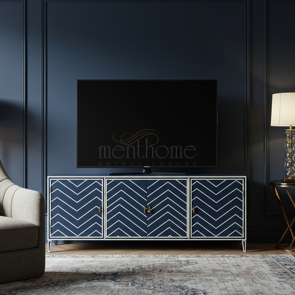 Inlay Chevron Pattern TV Cabinet in Navy Blue and White | Luxury Handmade TV Cabinet
