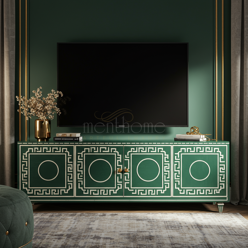Inlay Luxury Green and Gold TV Cabinet | Luxury Handmade TV Cabinet