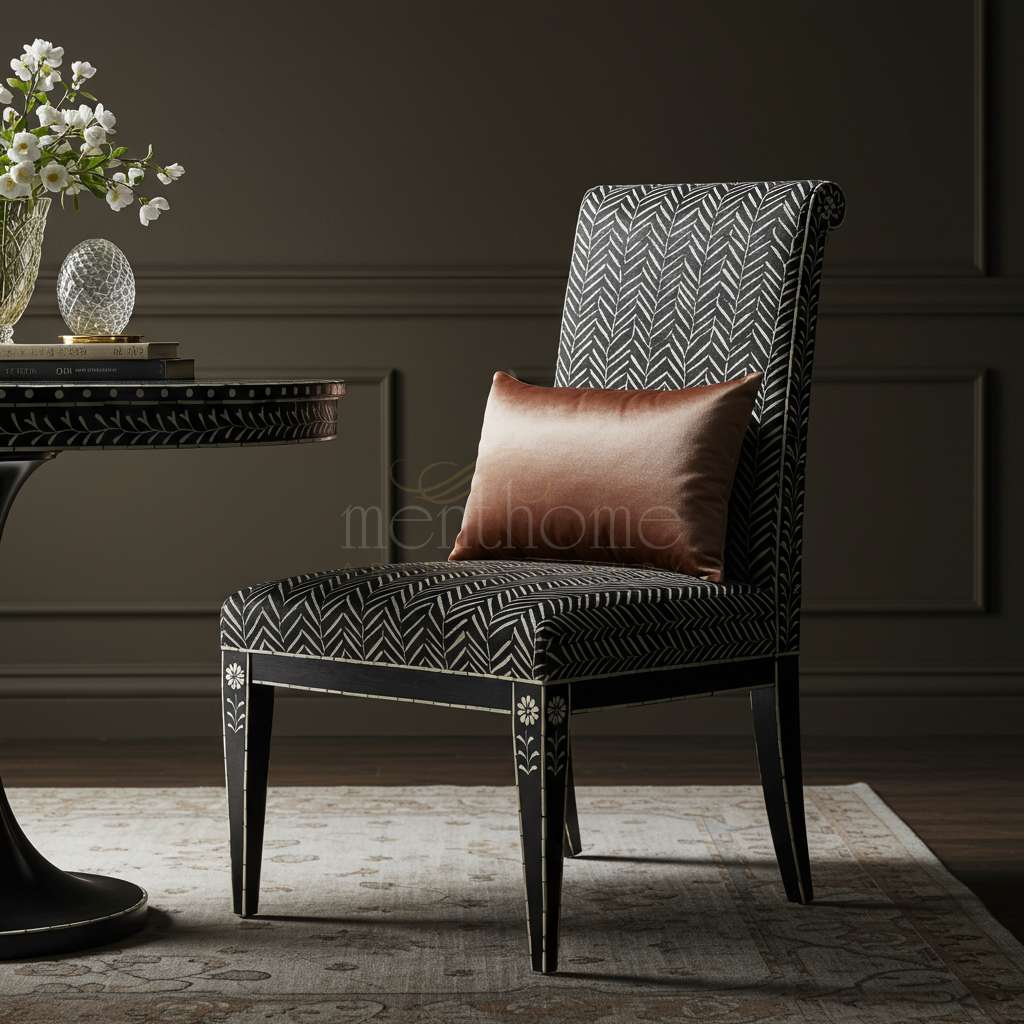 Elevate your interior with this exquisite Inlay Chair, featuring intricate hand-applied pattern detailing on its black wooden frame and a sophisticated geometric fabric upholstery. This luxurious dining or accent chair is complemented by an elegant rust-colored satin cushion, offering both comfort and style for upscale living or dining spaces.