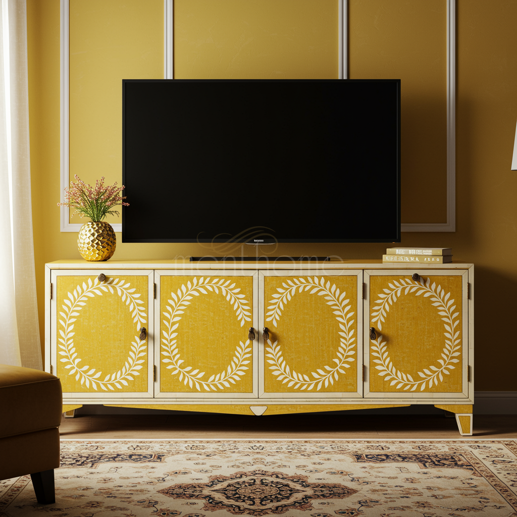 A luxurious inlay TV cabinet featuring a vibrant yellow finish with white leaf-patterned circular inlays on each of the four doors. Perfectly designed to combine elegance with functionality, this cabinet offers ample storage space and a sophisticated look that complements modern living rooms.