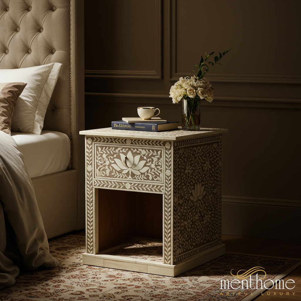 Intricately Carved Bone Inlay Bedside Table | Luxury Handmade Bedside Table