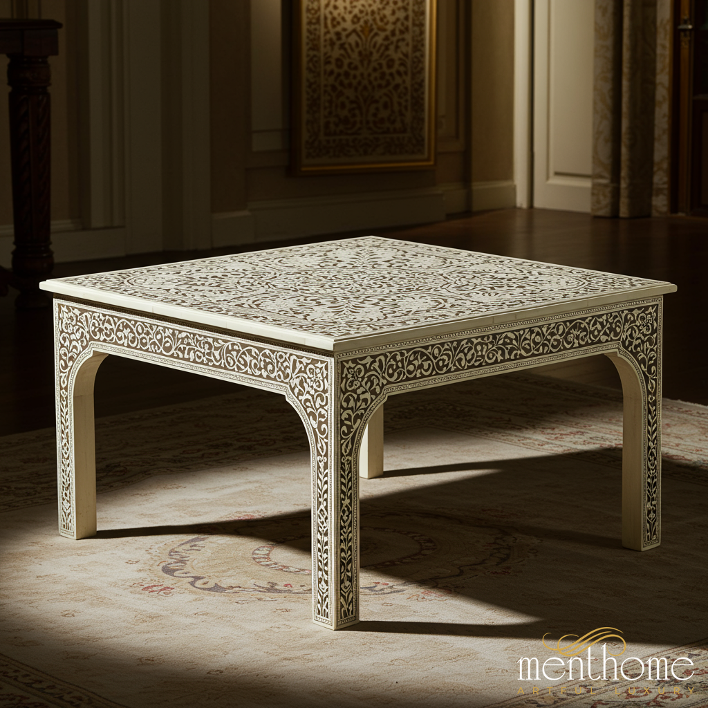 Intricately Carved Bone Inlay Square Coffee Table | Luxury Handmade Coffee Table