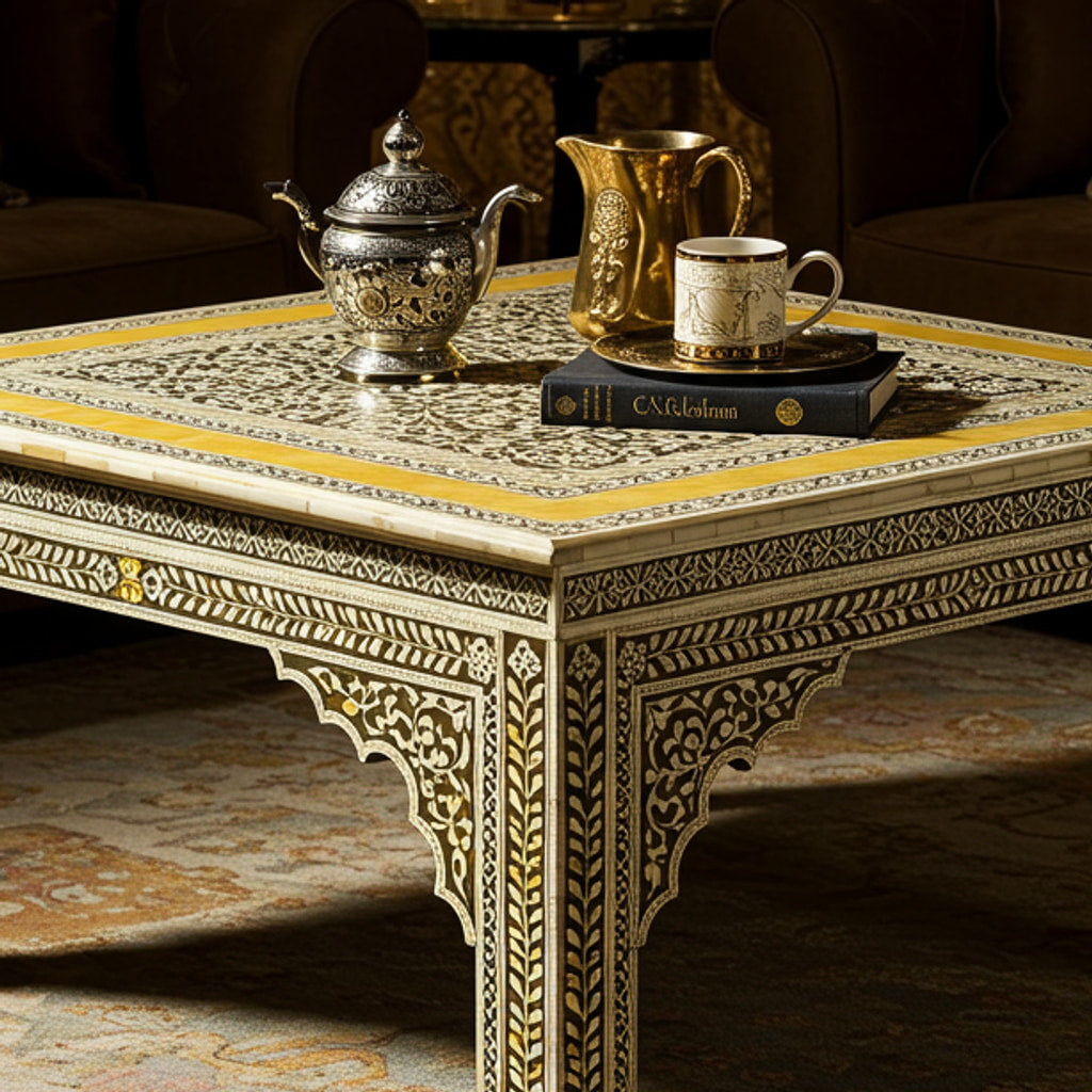 A beautifully crafted coffee table featuring intricate Moorish-style inlaid patterns. This elegant piece combines traditional artistry with functional design, making it a stunning centerpiece for any living space. The table is perfect for enhancing your home's aesthetic with a touch of luxury and cultural heritage.