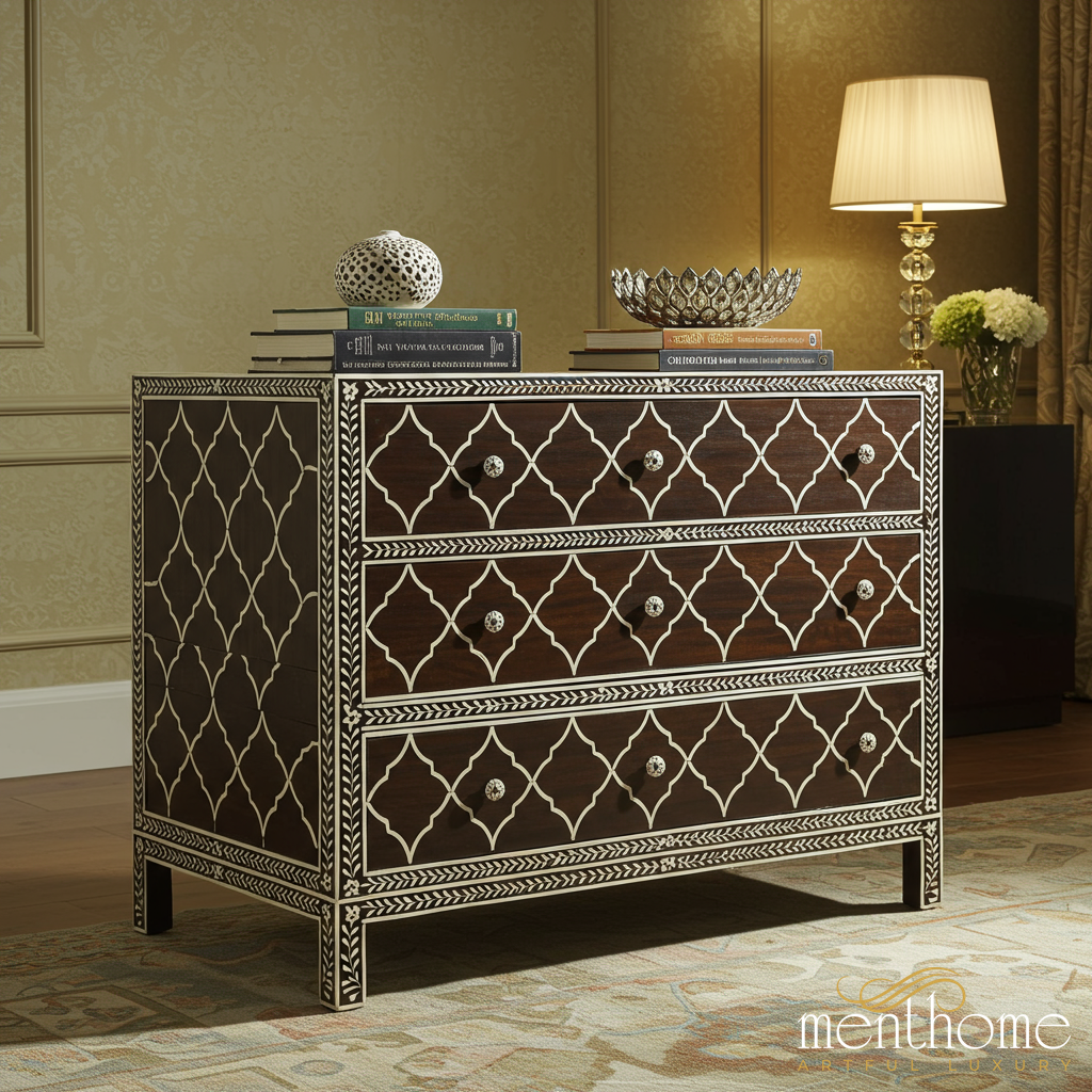 Intricately Designed Three-Drawer Wooden Dresser with Mother-of-Pearl Inlay | Luxury Handmade Chest of Drawer