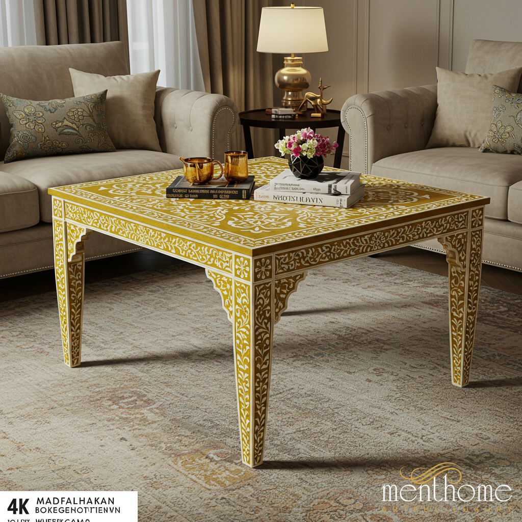 This exquisite coffee table features beautiful bone inlay work with a traditional floral pattern on a golden-brown lacquered surface. It blends artistic craftsmanship with functional design, making it an ideal centerpiece for any living room.